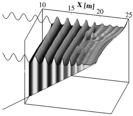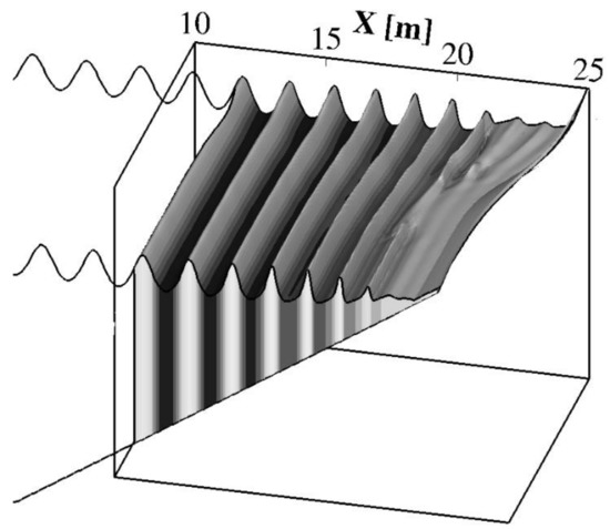 - Peregrine, D.H. Long waves on a beach. J. Fluid Mech. 1967, 27, 815–827. [Google Scholar] [CrossRef]