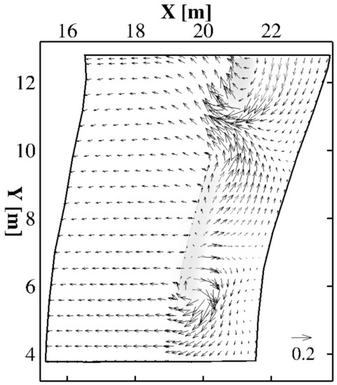 This difference in the wave height is shown in Figure 8a, where the wave height evolution along the two above mentioned sections is presented. Figure 8b shows the time-average (over 120 wave periods) of the cross-shore velocity components calculated near the bottom along the section in the gap between the barriers (section D-D’). In this figure, positive values represent offshore directed velocities.