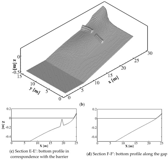 Figure 6a shows the bathymetry in presence of the two submerged breakwaters for the Case 1. A three-dimensional view of the bottom of the curvilinear computational grid is shown in Figure 6b. Figure 6c–d shows two significant cross-sections: one in the gap between the barriers () and another over the barrier (). The incident wave conditions are the same as the previous test: wave period and wave height .