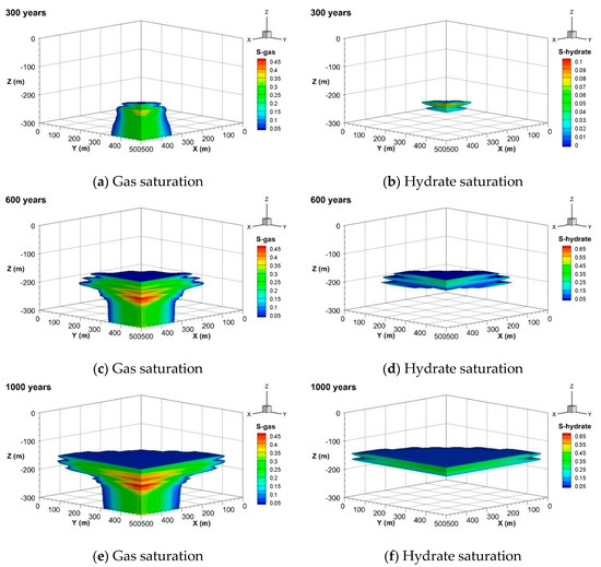 Figure 6 shows the gas and hydrate distribution characteristics of spatially heterogeneous reservoirs with a simulation time of 1000 years. Figure 6a,c show the gas and hydrate saturation on the section of x, y = 500 m, respectively. Figure 6b,d show the spatial distribution of gas and hydrate in reservoirs. The simulation results show that the direction of gas migration changes when the leakage gas enters the hydrate stability zone with heterogeneous porous space. Because of the gravity and methane buoyancy, there must be a difference between the contributions of lateral and vertical heterogeneity. Some of the gas is affected by the plugging effect of the low permeability sediments, and the migration velocity decreases and gradually accumulates in the lower part of the low permeability region. In the model, due to the random setting of heterogeneity, the spatial combinations of permeability are also diverse. These combinations can form some special structures, including some covers formed by low permeability grids and some channels formed by high permeability grids. Some gases continue to migrate along relatively high permeability channels, and the direction of migration is related to the distribution of high permeability channels. In this model, the gas migrates obliquely upward along the X direction (with an angle of about 30 degrees in the horizontal direction). The gas migrates obliquely upward in the reservoir until it encounters the overlying low permeability caprock, and then transfers horizontally. The gas saturation presents a non-uniform distribution in the reservoir as a whole. The formation of hydrate is closely related to the distribution of gas migration. The gases blocked by low permeability reservoirs migrate outward, mainly by diffusion, to form low saturation and deep buried hydrates. Some gas migrating upward along the high permeability channel forms inclined hydrates when it moves in the channel, and the other part of the gas forms hydrates in the process of lateral migration after encountering the overlying layer, which mainly distributes horizontally. The thickness of the hydrate layer is related to its distance from the vertical channel: the thicker the hydrate layer extends outwards, the smaller the thickness of the hydrate layer. In spatially heterogeneous reservoirs, hydrate saturation, burial depth and the thickness of the hydrate layer are not only controlled by the temperature and pressure conditions of the sedimentary layer, but also related to the distribution of reservoir porosity and permeability. The heterogeneity of the reservoir space directly affects the gas migration in the stable zone, and at the same time, it may form a local gas trap structure, controlling the formation and enrichment position of hydrate, which has a great influence on the formation and accumulation of marine hydrate.