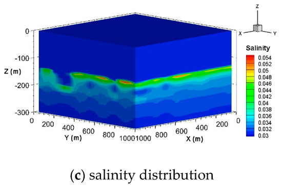 In order to further explore the influence of spatial heterogeneity on gas migration and hydrate formation, based on the original model, the scheme of gas injection was changed from the middle pathway to the whole bottom surface. Figure 7 shows the simulated gas, hydrate and salinity distribution. The results of the surface injection model can more clearly show the important influence of heterogeneous marine formation on the migration and accumulation of lower leaking gas. Sediments with different permeabilities in their formation were combined vertically and horizontally in a variety of arrangements, which formed an advantageous channel or barrier for gas migration. Hydrate distribution also shows horizontal and vertical differential distribution under this condition.