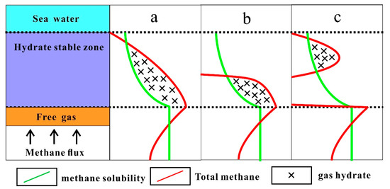 In the hydrate stability zone, hydrate formation occurs only when the total methane content is higher than the methane solubility. Figure 9 shows the hydrate formation mechanism under three typical gas migration conditions: (1) There is no low permeability plugging layer in the vertical homogeneous formation, and the high flux of lower gas corresponds to the high saturation and thick hydrate layer (Figure 9a); (2) If there is a low permeability plugging layer in the middle and upper part of the stable zone, when methane migrates to the low permeability layer, vertical migration weakens and lateral migration strengthens. The hydrate formed in this area is mainly located at the lower part of the stable zone, and the horizontal extension range is larger but the thickness is relatively smaller. This phenomenon also occurs when the hydrate layer has an obvious self-sealing effect (Figure 9b); (3) If there is a low permeability plugging layer at the lower part of the stable zone, only a small amount of methane enters the stable zone from the free zone, whereas when there is a lateral hypertonic gas transport channel, then a lateral gas supply will occur. When it exceeds the methane solubility, a hydrate layer will be formed in the channel or at the outlet of the channel. The location and depth of the hydrate are related to the channel (Figure 9c). In sediments with heterogeneous porosity and permeability, the gas migration processes are complex and diverse, and the hydrate formation mechanism is mostly the combination of the above three processes.