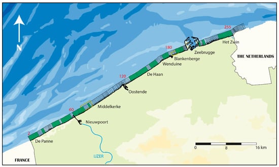 - Houthuys, R. Morfologie van de Vlaamse Kust in 2011, Agentschap Maritieme Diensverlening en Kust; Afdeling Kust: Oostende, Belgium, 2012; pp. 1–150. [Google Scholar]