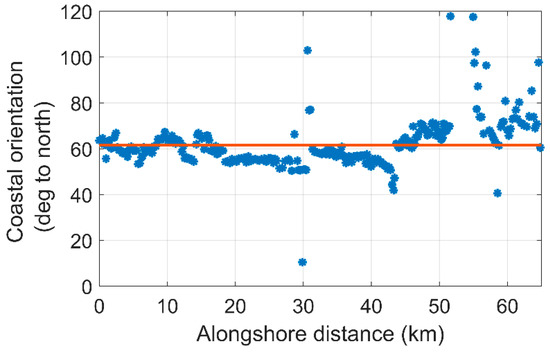Coastal orientation of the Belgian coast. It represents the orientation of dunes or dykes. The mean coastal orientation is 62° with respect to the north (red line).
