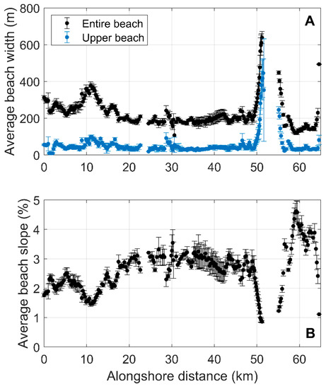 The Belgian coast consists of sandy beaches, which are generally up to 400 m wide in the southwest and only 150 m in the northeast (Figure 3). Beach width is defined here as the horizontal distance between mean low-water level (+1.39 m TAW1) and dune foot (+6.89 m TAW). During springtide, beach width can range from 100 m to 600 m [26]. The upper beach width, defined as the horizontal distance between mean high-water level (+4.39 m TAW) and dune foot (+6.89 m TAW), ranges from 30 m to 100 m. The beaches along the entire coastline are very gently sloping, although the slope increases from west to east (Figure 3). Due to the construction of the jetties (approximately 3 km in length) of Zeebrugge harbor (between 52–55 km alongshore), the beach width is relatively large, causing a very mild beach slope in that region.