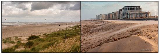 Located between France and the Netherlands (Figure 1), the modest 65 km long Belgian coast was historically characterized by sandy beaches, backed by wide sand dunes, mudflats and tidal marshes [24]. However, over the last 50 years, these marshes and mudflats were modified by draining and diking them to develop agriculture, habitation and major economical recreation [25]. Nowadays, like many coastal areas worldwide, the Belgian coast faces increasing challenges due to coastal erosion, sea-level rise, and an increased risk of flooding.