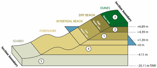 In the 1980s, on the basis of elevation boundaries, the Belgian coast was also divided into five cross-shore horizontal elevation slices [29,30]. Following Figure 6, slice 1 comprises the intertidal beach with elevations between +1.39 and +4.39 m TAW, slice 2 is the dry beach with elevations between +4.39 and +6.89 m TAW, slice 3 represents the dune area above +6.89 m TAW, slice 4 is the shoreface with elevations between −4.11 m and +1.39 m TAW, and slice 5 is the sea bottom below −4.11 m TAW. Initially, these elevations were defined by the Department of Mobility and Public Works (MOW) relative to the Z vertical datum (−4 m, 1.5 m, 4.5 m, and 7 m Z). Later, these were converted to the TAW vertical datum by subtracting 0.11 m. The elevations are conventional boundaries and have not been derived on the basis of tidal water level variations [24].