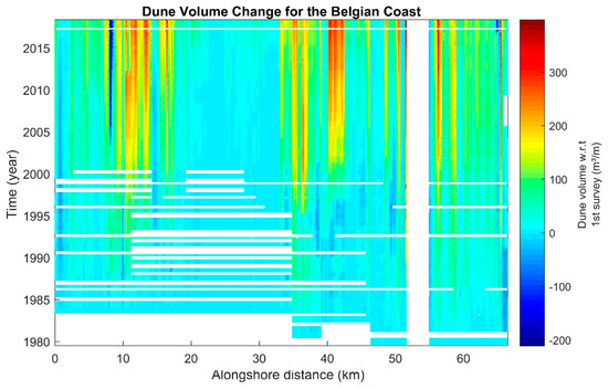 Figure 7 gives an overview of all the available dune volume data with respect to the first survey at the Belgian coast. Blank bars indicate no performed LiDAR flights and thus no available survey data. Some regions (especially the dune regions) experience a growth in time (yellow to red color). Other regions (in particular the regions that are diked) remain stable in time.