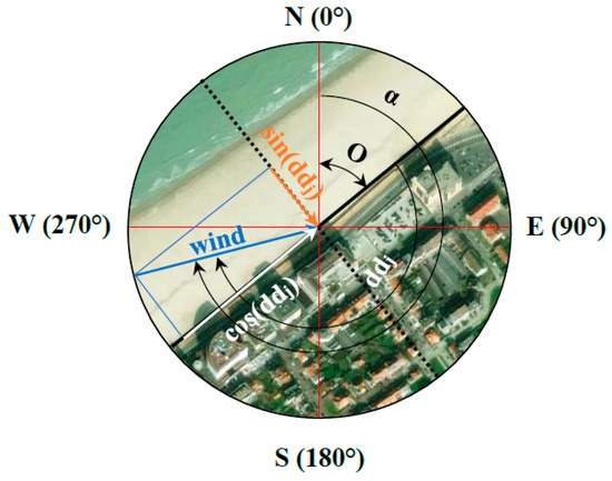 Orientation (O) of the Belgian coastline and calculation procedure of potential transport. The orange arrow shows the onshore direction of sediment transport towards the dunes and is used to explain dune behavior. The angle α is the wind direction (with respect to the north) and the angle ddj is the difference between the wind direction and coastal orientation O.