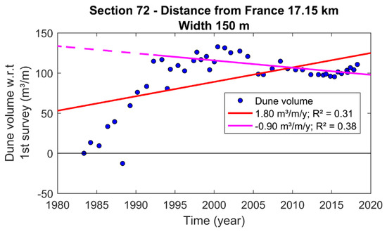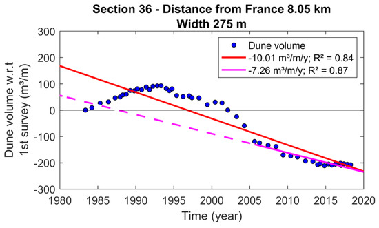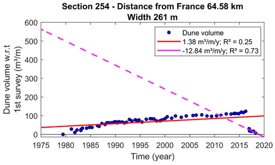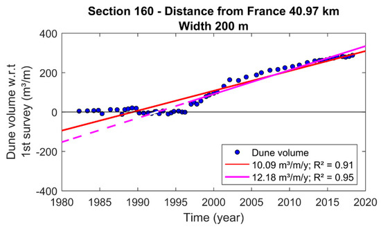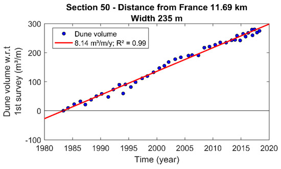 Example of dune volume in time combined with a linear fit (correlation of determination R2 = 0.99) for coastal section 50 (natural dunes).