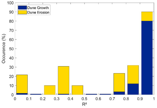 Decadal timescales are of interest because it is the most appropriate timescale for engineering purposes and coastline development. On decadal timescales, potential dune volume appears to grow linearly with time, with a similar magnitude to the observed dune volume (see Section 4.3). It is of particular interest if both are correlated at this spatial–temporal scale. For all coastal dune sections, the decadal trend of potential dune volume changes is based on linear analysis. Linearity is calculated for the entire period between 2000–2017. It is found that in 93% of all coastal dune sections, the potential dune volume trend has a correlation higher than 0.90.