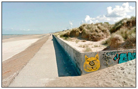Figure 12 shows dune volume changes between 1983 and 2018 for section 8. In the past, section 8, close to the French border, experienced intense dune erosion during storm events. For coastal safety, a dune foot reinforcement was constructed (concrete dyke) in the period 1976–1979. In 1990, this concrete dyke was extended on the east side after a severe storm surge. Massive erosion in the coastal zone was caused by heavy storms at the beginning of 1990 and storms in the period 1993–1994. In a part of section 8, a concrete wall was erected in 1994 above the dune foot reinforcement (Figure 13). Sand was also applied above the dune foot from the low-water line. Sand was again supplied after the storms of 1–2 January 1995, 19 February 1996, 29 August 1996 and 29 October 1996. Due to the influence of dune foot reinforcement, the dune volume of section 8 does not experience a linear trend in time. The natural behavior of the dune has been completely blocked. As such, dune reinforcements are not suitable for climate-resilient flood protection.