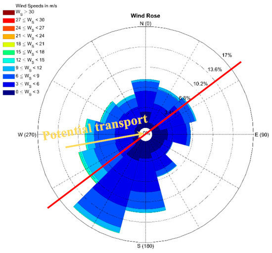 Measured wind speed (Ws) and wind direction at Ostend Airport weather station for the period 2000–2017. The red line represents the Belgian coastline direction. The potential transport drift is also given.
