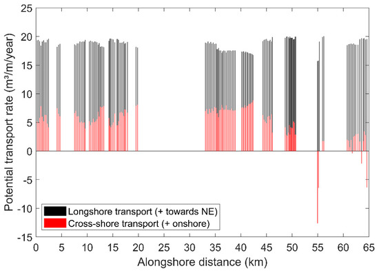 Interpreting the results on a decadal timescale, all potential transport rates are cumulatively summed. Potential dune volume changes because of aeolian sediment transport appears to vary linearly in time with a constant rate, which in return explains the decadal linear dune growth (Figure 24). Considering all coastal dune sections within the period of 2000–2017, Figure 25 indicates that onshore potential transport maximum ranges to 9 m3/m/year (average = 5.2 m3/m/year), while longshore potential transport could reach up to a maximum of 20 m3/m/year (average = 18.7 m3/m/year), assuming dry beach sand. In return, this gives a mean total potential transport of approximately 20 m3/m/year. Longshore transport is relatively constant along the coastline (4.9% deviation of the mean). Onshore transport has some longshore variations due to a varying coastline orientation, especially behind the protruding point of Wenduine (43 km), where transport is lower due to a more north–northeast coastal orientation. It also implies that longshore transport is almost three to four times higher than onshore transport. This would explain why brushwood fences are so efficient for enhancing dune growth locally.