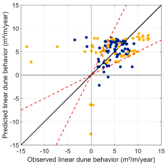 Figure 27 shows the alongshore extent of the observed and predicted dune development rates along the Belgian coastline. The variability in potential transport is well correlated to the variability in dune volume changes at the considered spatial–temporal scale. The general variability, on a decadal timescale, between observed and predicted rates could be partly attributed to the management activities at certain sections along the coast. It is uncertain how many of the dune regions are managed. An attempt has been made to know which dune regions are managed. Based on historical images from Google Earth, approximately 50% of the coastal dunes are managed. Most of these activities include regular plantation of brushwood fences, especially where observed linear dune behavior is higher than the predicted values (under the line of perfect agreement). Other discrepancies include the ones discussed in Section 4.4.1. The locations including dune foot protection measures, dune foot reinforcements, and dune blowouts, are mostly the locations where predicted values are higher than the observed values. When the managed zones are excluded from the data set, the best fit line slope is approximately one, and the RMSE (Root Mean Square Error) value is 2.9 m3/m/year. Most (90%) of the predicted data are within a factor of two of the measured values. This is a high score, given all variabilities and non-uniformities involved in aeolian processes (wind field, sand composition, bed relief, surface roughness). The finding of potentially stronger correlations compared to the literature (e.g., [4,18]) at the Belgian coast are most likely caused by the generally wider beaches (between 150 m and 400 m). Keijsers et al. [18] also found stronger correlations between the time series of potential sediment transport and dune volume on wider beaches (>200 m) at the Dutch coast. This indicates that natural dune behavior can be predicted with a reasonable accuracy on decadal timescales, and it suggests that annual differences in forcing and transport limiting conditions (wind speed and surface conditions) only have a slight effect on the overall variability of dune volume trends.
