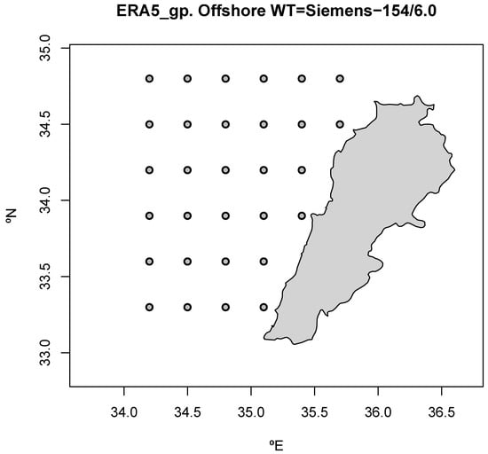 It is to be noted that for implementation of wind-energy facilities in Lebanese waters, there were some practical constraints that deserve a brief mention even though they fall beyond the scope of this study. The Lebanese exclusive economic zone (EEZ) extends 200 nautical miles from the coast and, according to Lebanese legislation, there is a buffer area of 3 km [,] in which economic activities like wind energy could not be allowed. It is also worthwhile to mention that water depth increases rapidly as we move from the coast into the sea, thus making floating wind turbines the best solution for any future wind farm. For this reason, hub height h of 178 m corresponding to the SIEMENS 154/6 floating wind-turbine model was chosen to estimate wind power density. However, the current maximum technological limits are 120 km of AC cable to the coast and a mooring limit of 1000 m depth []. These practical constraints are represented in Figure 3 where wind turbines represent the location of the ERA5 gripdoints falling within the current administrative boundaries. It is important to mention that some of these constraints, both legal and technical, may change or disappear in the future. For this reason, they have been ignored for this study, although they should be considered for detailed analysis of wind-farm design.