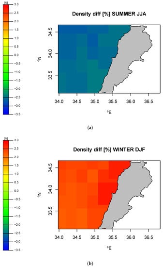 Seasonal air density differences of [%] with respect to = 1.19 . (a) Summer. (b) Winter.