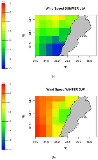 Lebanon offshore-wind speed at 178 m. Seasonal averages from hourly values. (a) Summer. (b) Winter.