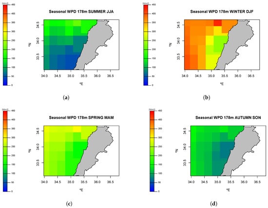 Wind power density at 178 masl. . (a) Summer. (b) Winter. (c) Spring. (d) Autumn.