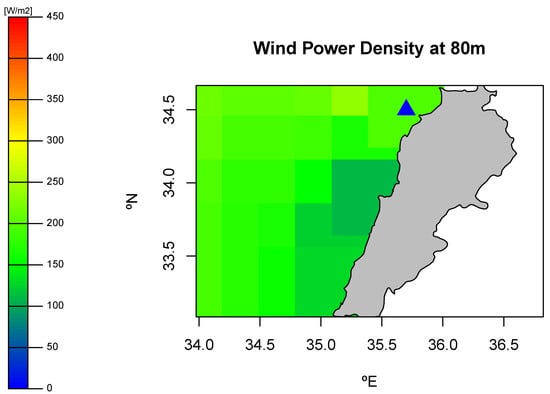Younes et al. [] suggested that a decentralized policy for energy production could contribute to the economic feasibility of incorporating renewables into the Lebanese electric system. In the case of wind energy, a study indicated that offshore wind energy could be used to support or complement existing power plants [], but to that purpose, accurate estimation of wind resources is needed. Inland wind-energy potential has been partially assessed using a limited number of sensors [], but the most comprehensive study carried out so far on Lebanese wind-energy potential is the National Wind Atlas, prepared by the United Nations and made public in 2011 []. In the case of offshore wind energy, the National Wind Atlas provides estimations of wind power density () at a height of 80 m for the Lebanese coast. The methodology applied in Atlas involves the use of wind-sensor records and a numerical model. Specific details are extensively described in the original document [].