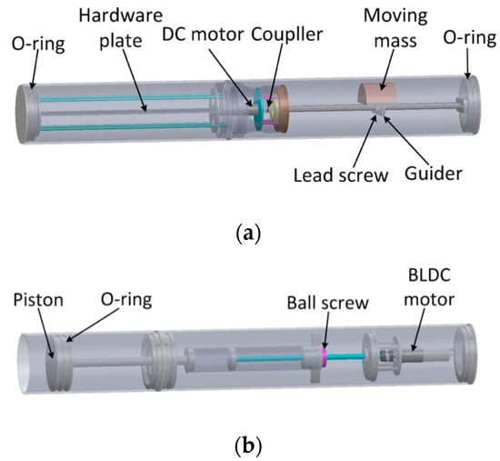Mass-shifter (a) and buoyancy engine (b) design. A DC motor is used in the mass-shifter, and a Brushless DC motor is installed in the buoyancy engine.
