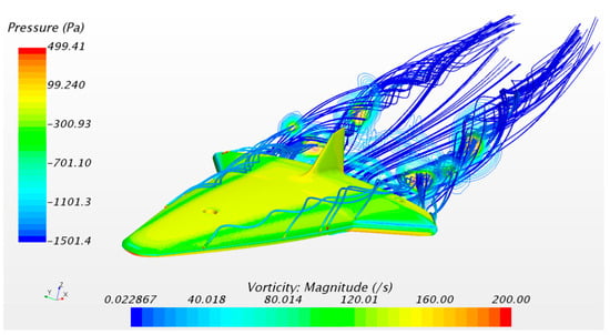 The planar motion mechanism (PMM) test for the hydrodynamic coefficients is very expensive. Therefore, to obtain the hydrodynamic coefficients of this new hull design, CFD calculation is performed. One of the results of the vertical drift calculation that varies from to is presented in Figure 4 as an example. In Figure 4, the surface contour on the RHUG hull indicates the pressure field acting on the hull. The line contour around the hull is the fluid flow in the vertical drift test. From the CFD calculations, we found that the weak vortex shedding occurred at the both wing edges. The surge and heave force acting on the RHUG hull in the various vertical drift angles are presented in Figure 6 and Figure 7, respectively.
