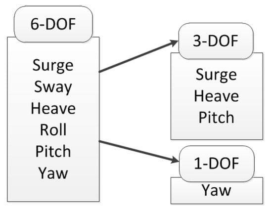 In the RHUG design described in Figure 3 and Table 1, the sway and roll dynamics do not have any actuators. For now, the stability of the roll motion is dependent on the vertical passive stabilizer, as shown by the CFD analysis result in Figure 4. As the main objective of the RHUG hull design is gliding motion, the sway and roll dynamics were neglected in the RHUG modeling in this study. Under this condition, the dynamics of the RHUG are separated into two, as shown in Figure 5. The first dynamics are surge–heave–pitch motion, which are the vertical-plane dynamics in the plane. In the vertical-plane motion, the coupling terms among surge, heave, and pitch motions cannot be neglected in the RHUG gliding motion. The second type dynamics is yaw motion, which is heading motion. Therefore, the RHUG dynamics are presented in terms of vertical motion and heading motion individually.