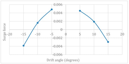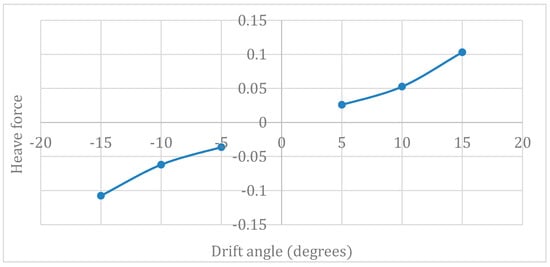 The acting force in the surge direction was computed from pitch angles of to . In the drift calculation, the nondimensional maximum and minimum surge force are 0.0048 at and –0.0039 at , respectively, as shown in Figure 6. The heave force acting on the hull was also calculated from a pitch angle of to . The magnitude of the nondimensional heave force increases as the magnitude of the pitch angle increases, as shown in Figure 7. The dimensionless hydrodynamic coefficients from the CFD results are shown in Table 2.