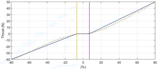 The thrusters in this platform were T200 thrusters (Blue Robotics, Torrance, CA). The experimental data were provided by Blue Robotics. In Figure 8, the thrust force ranges from –40 to 50 N with the input signal ranging from –80 to 80%. This relationship can be illustrated as the set of equations in Equation (5), where the subscript letter . The control force and moment can be calculated from thruster force using Equations (6) and (7), where is the surge control input for speed control in the body-fixed frame, is the yaw moment in the body-fixed frame, and are the forces of thrusters on the starboard, and are the forces of thrusters on the stern, is the distance of the two thrusters on the starboard, and is the distance of two thrusters in the stern: