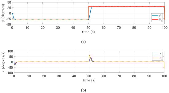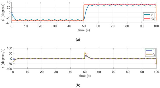Simulation results of heading performance with robust control. (a) Heading angle is regulated to and . (b) Yaw rate is regulated at degrees/s.