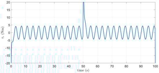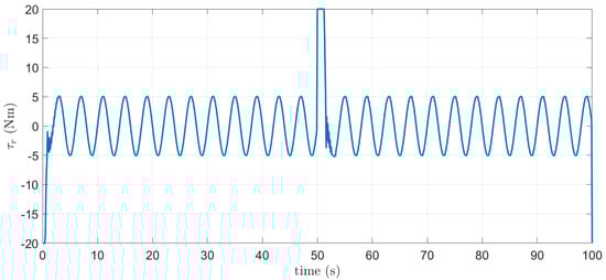For simulation purposes, the RHUG heading dynamics were assumed to have the parameters listed in Table 3. The external disturbance was chosen as ; then, . Nm and . The input saturation was defined as Nm. The heading angle was regulated between and . The desired yaw rate and yaw acceleration were chosen as degrees/s and degrees/s2. Other gains were chosen as , , and .