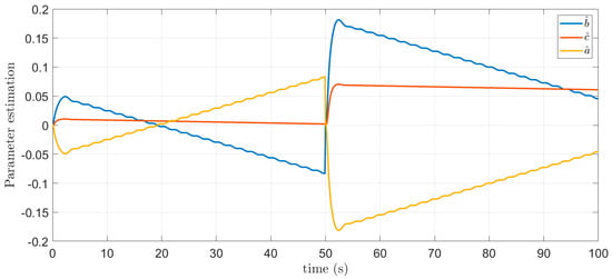 In the parameter adaptation, convergence can be observed in Figure 14. All three estimated parameters converge to three constant values in each regulation task, and the real parameters are , , and . The estimation of adaptive control does not converge to real constant parameters. This also shows that once the system enters the boundary layer, the adaptation action decreases, as the error dynamics do not excite the adaptation action and only robust control is used to eliminate the effect of external disturbance.