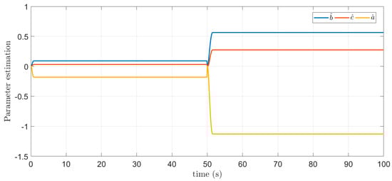 Notably, Equation (30) does not guarantee that the estimation error of the parameters converge to zero. The parameter estimates can be viewed as extra states of the controller that help with the control task.