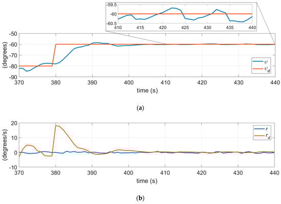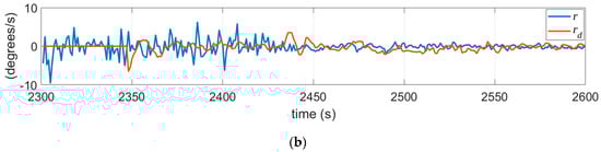 Experimental performance of heading and yaw rate in the sea in front of the Korea Maritime and Ocean University (KMOU, Busan, South Korea): (a) Heading control performance (b) virtual control performance.