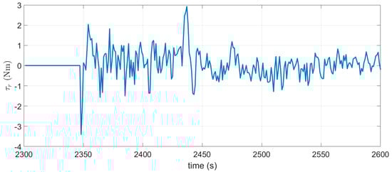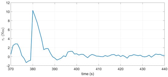 Figure 10 shows the control effort of the adaptive control in Equation (31). This control smoothes the motion, but cannot eliminate the external disturbances. The adaptation law for the unknown parameters does not converge to any constant values, as shown in Figure 11, whereas the real parameters are , , and . Due to the effects of external disturbances, the estimation of the three parameters of the heading dynamics cannot converge to a constant value.