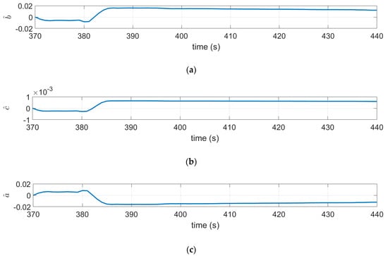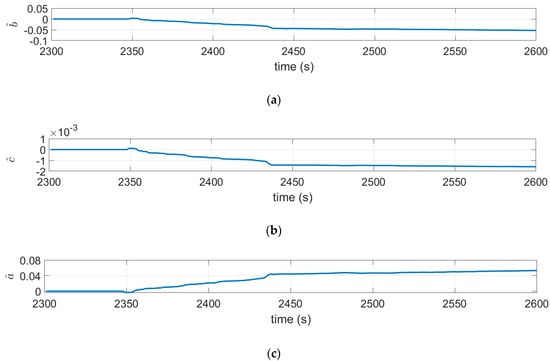 Experimental adaptation of three unknown parameters during the gliding test in the sea: (a) estimation of parameter , (b) estimation of parameter c, (c) estimation of parameter a.