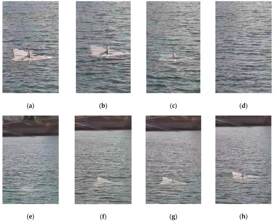 One gliding test cycle with robust adaptive heading control was conducted in front of Korea Maritime and Ocean University (KMOU, Busan, South Korea) as shown in Figure 18. Figure 18a–d describes the descending motion of RHUG at a heading angle, whereas Figure 18e–h shows the ascending motion of the RHUG at a heading angle. The assumption for the external disturbances is the same as for the simulation with the disturbance bound of 5 Nm, as they could not be measured. All control gains were the same as in Section 4.
