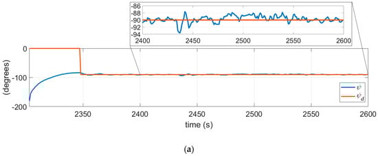 We performed heading control in a water tank using robust adaptive control. The attitude heading reference system (AHRS), named the MTi model from XSENS (Enschede, The Netherlands), was used to measure the heading angle, and the yaw rate of the vehicle was measured using the gyro sensor inside the AHRS. Figure 15 shows the result of heading control in the water tank using robust adaptive control. The heading angle was regulated to with less than error, and the virtual control input and the yaw rate were regulated at zero, as shown in Figure 15a,b, respectively.