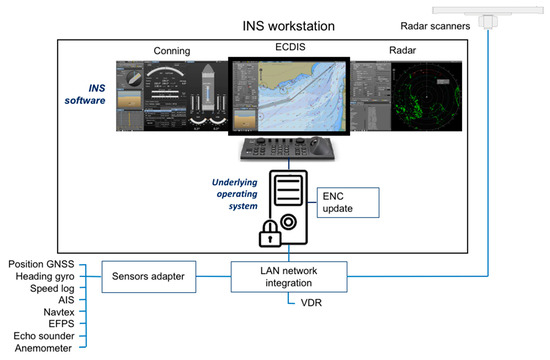 The integrated navigational system (INS) is a composite system, whose purpose is to enhance the effectiveness and safety of ship navigation by providing the multifunctional display on the basis of integration of at least two navigational functions [25]—collision avoidance using a radar sensor and voyage route monitoring using the Electronic Chart Display and Information System (ECDIS) [26]. The INS is essentially a software platform for fusion of data from the major radar and ECDIS systems with sensors for the additional navigation functions of route planning, status and data display, and alert management. The INS is recognized as the one type of equipment by IMO and its functionality is standardized with the performance standards [26].