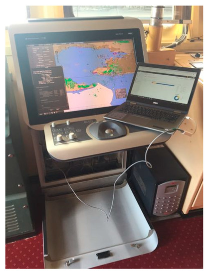 The cybersecurity testing of the INS was conducted with the world’s most widely deployed industry vulnerability scanner, Nessus Professional version 8.0.1 [29]. Vulnerability scanning is a passive method of reviewing the INS to gain comprehensive insight into all vulnerabilities that are already known to the cybersecurity community, attackers, and software developers [6,30]. A laptop with the installed vulnerability scanner was connected directly to the INS with a crossover Ethernet cable. The INS software was running with administrative rights, whereas the remote scanning was conducted without administrative permission. Figure 3 shows the testing setup. During the testing, the ship was docked in a port. The INS was activated to use the ECDIS as the base display layer, together with the radar and conning data (Figure 3).