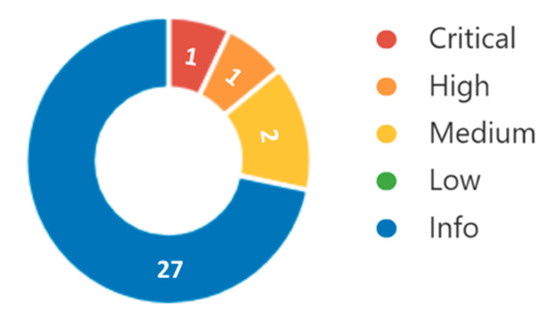 The scanning report summary is shown on Figure 4. In total, 4 vulnerabilities and 27 pieces of information were detected. According to the severity level, the report showed that 1, 1, and 2 vulnerabilities were assigned under the critical, high, and medium severity, respectively.