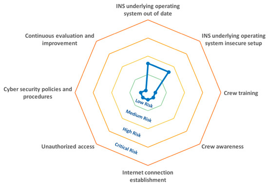 The INS cyber risk levels were calculated by multiplying the impact magnitude value with the likelihood value. The given result represented the qualitative cyber risk level: (i) acceptable low risk (product of the multiplication was lower than 25), (ii) medium risk that is acceptable for a short time (product of the multiplication was between 25 and 50), (iii) high risk demanding a risk mitigation plan (product of the multiplication was between 50 and 75), and (iv) critical risk demanding instant action (product of the multiplication was higher than 75). Figure 5 shows the cyber risk-level radar graph of the results obtained with the qualitative risk analysis.
