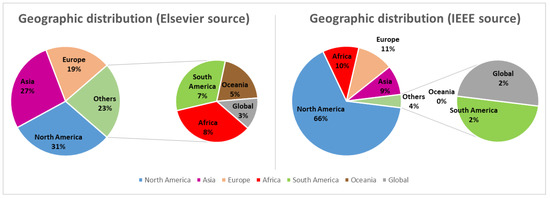 Figure 5 shows that research activities in stream current power domain comes in the majority from the North American continent, particularly in the IEEE resource. This trend is significantly due to an important number of IEEE conferences on North American soil. Asia globally comes in second position with China leading, followed by India and Malaysia. In Europe, the United Kingdom (UK) is logically the leader, since its coasts possess most of the MCP operation locations, followed by France and Italy. On the African continent, South Africa records practically the entirety of publications; in South America, it is Brazil, and Oceania is the less represented in terms of paper. For the latter, this statement can be explained by the narrow referencing of papers written in Spanish or Portuguese language and by the energy strategic of Australia, most populated country in Oceania, of which the electricity produced is mainly thermal generation, although a current power exploitation potential has been identified near its north coast in Hemer et al. [11]. The ’Global’ category regroups the papers coming from collaborations between several laboratories of different countries.