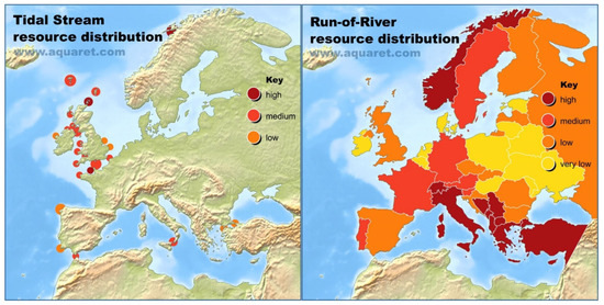 Distribution maps of tidal stream and run-of-river resources (based on rainfalls and river drop) [14]. ©Reproduced with permission from Aqua-RET Project, 2019.