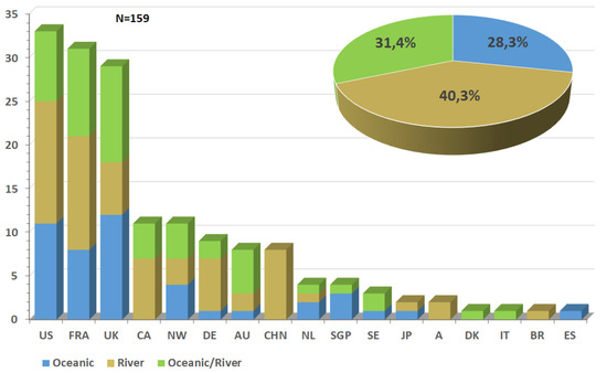 A market study ordered by SEENEOH (national estuarine experimental site of hydrokinetic device optimization and test) was realized by Energie de la Lune and a public partial synthesis is available on the project website [19]. The market sectors, Figure 10, show the number of patented hydrokinetic technologies by country and illustrate the observation previously made with a majority development of RECP worldwide, followed by the development of systems which can work as well in rivers as in ocean.