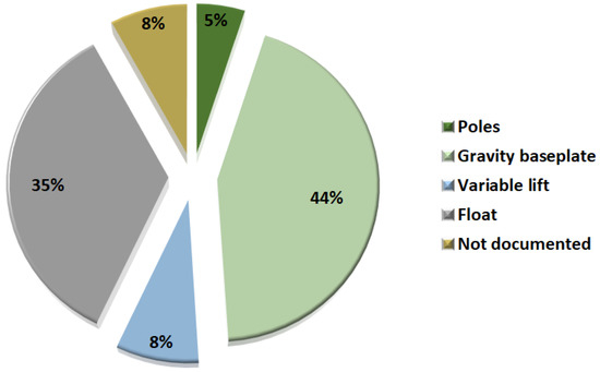 The proportion of mounting system, Figure 12 is related to the hydrokinetic generations, with a majority of gravity baseplate, followed by the float use, privileged in the second generation.