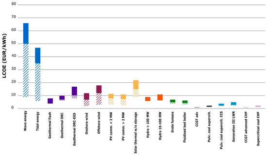 LCOE for different energy technologies [9]. The solid bars indicate the actual LCOE span and the striped ones, the future cost reductions expected. ©Reproduced with permission from Elsevier, 2018.