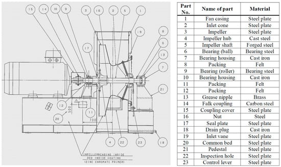 The analyzed forced draft fan is driven by an induction motor and used in the marine steam propulsion system of a LNG carrier for combustion air supply to the steam generator [52]. The fan is a radial (centrifugal) type, with inlet vanes for the control of the air mass flow rate. The fan cross-section along with the connections to the induction motor is presented in Figure 1. The main parts of the analyzed forced draft fan, along with the used materials are presented in Figure 1. The operating parameters and characteristics of the forced draft fan are presented in Table 1.
