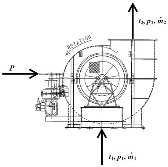 For the analyzed forced draft fan, all the inputs and outputs are presented in Figure 2. The inputs are the electrical drive power and the air at the fan inlet (marked in Figure 2 with number 1), while the output is only one—the air at the fan outlet (marked in Figure 2 with number 2). The air specific enthalpies and specific entropies were calculated from the measured pressures and temperatures at the forced draft fan inlet and outlet by NIST REFPROP 9.0 software (National Institute of Standards and Technology-U.S. Department of Commerce, Gaithersburg, MD, USA) [77].