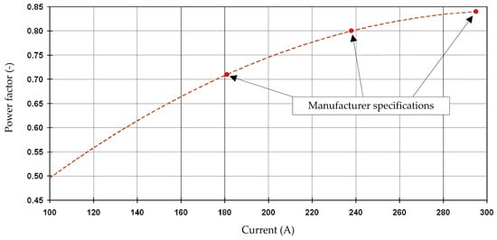PF is the power factor of the induction motor. The change in the power factor is given by the induction motor manufacturer, as listed in Table 2. The analyzed induction motor (product code: 3GCA 312 510-ADA, manufacturer: ABB) [52] has only three power factor values with regard to the induction motor stator current. These three values of a power factor are insufficient for the calculation of the power factor in the entire operating range. Therefore, a second-order polynomial is derived (power factor in relation to stator current) for the observed induction motor, which approximates the values in the entire operating range (Figure 3). The derived polynomial is: